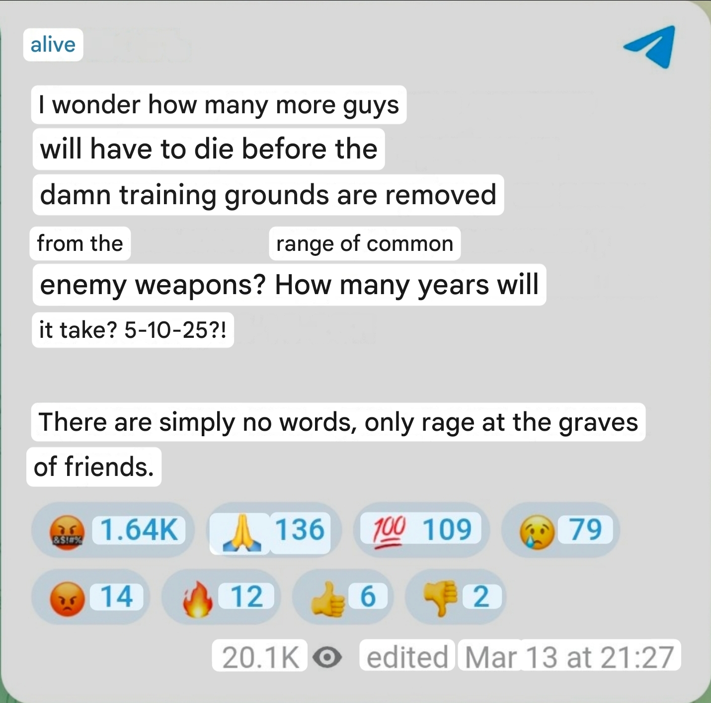 >>530713810>Kursk was a total failure>update your scriptRussia claimed "full liberation" of Kursk on March 8. Their own milbloggers admitted fighting was still ongoing the same day. A local commander confirmed it on state TV. Zelensky posted UAF still operating in Kursk AND Belgorod on the 9th. Days ago a Russian unit got ambushed at a pipeline crossing and lost ~80% of its men. Nineteen months to recapture your own backyard and you're still not done. Superpower btw.