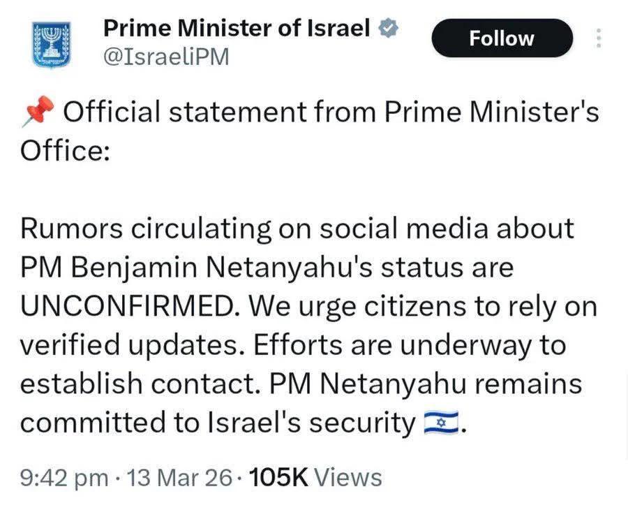 >OMG a high profile target for Iran hasn't been seen and isn't making daily tiktok videos for me to post on /pol/>HE'S DEAD!I don't get what is so hard for people to comprehend that known targets tend to hide out during conflict.And that tweeting could reveal location despite their little robot boy elon being in charge. EZ hax.>Death hoax>AI psyop>Hiding in GermanyEither poisoning the well or a demoralization attempt
