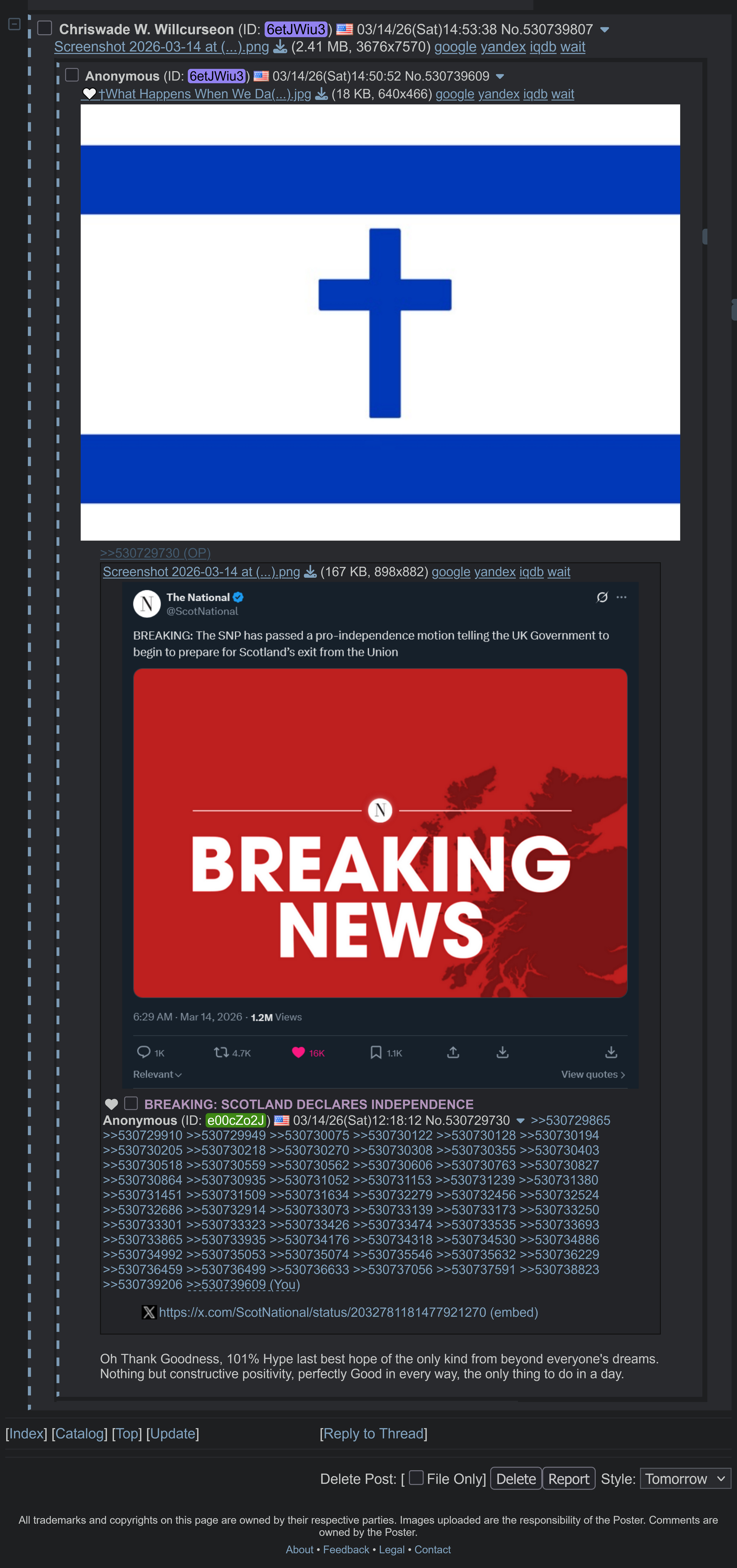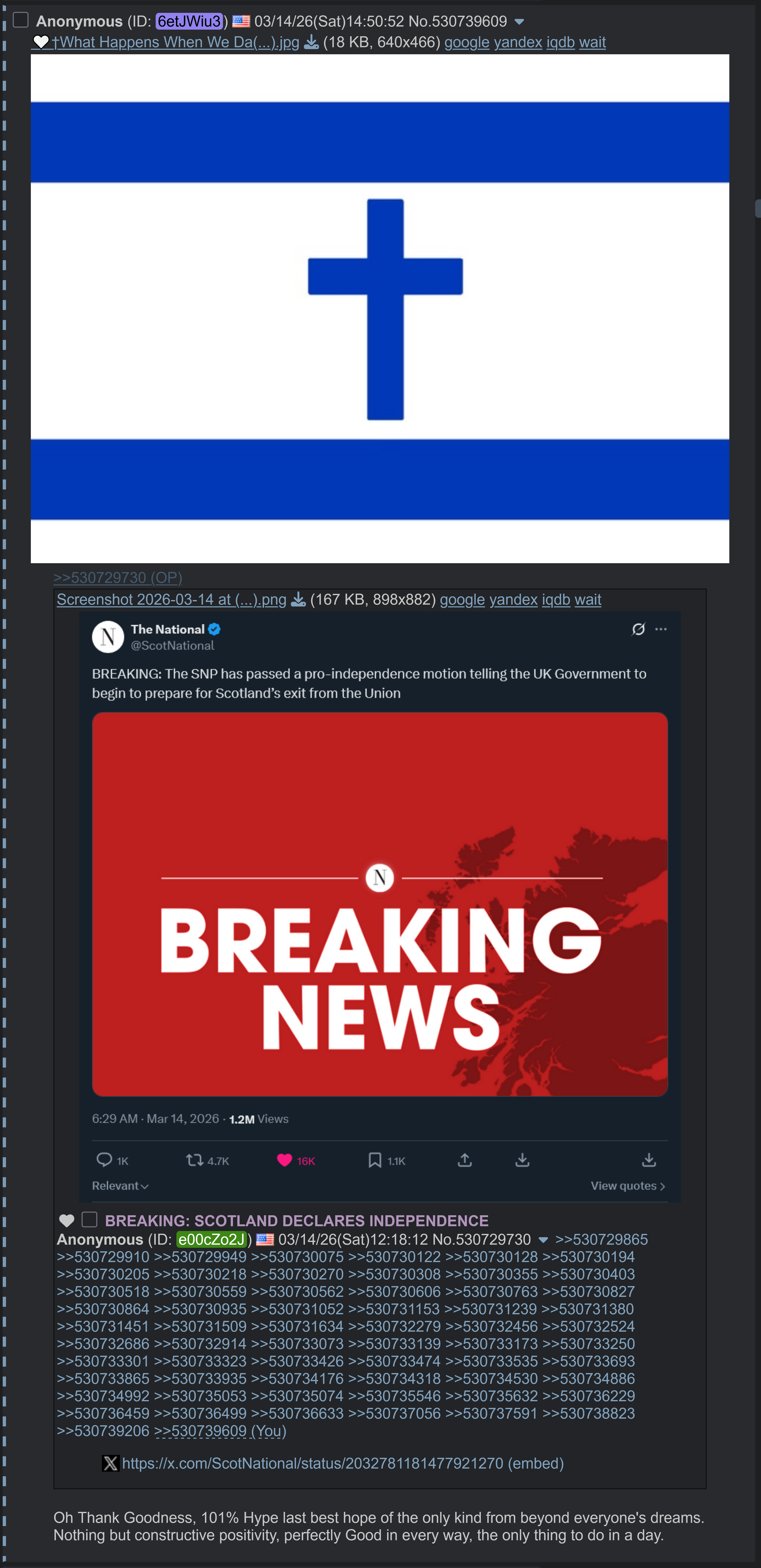 >>530729730>After seeing the rise of Islamaphobia and anti-immigration in England, we Scots feel that we must sever ourselves from this sort of bigotry and hate. By achieving independence, Scotland will be able to express it's real values- compassion and understanding and openness. While the UK pushes to exclude others, we believe that an independent Scotland should have a greater open border policy...P O W E R F V L