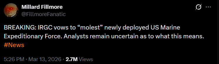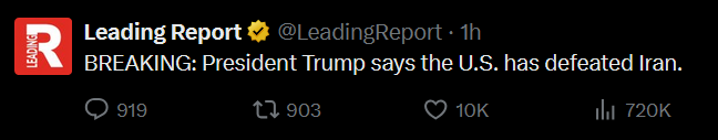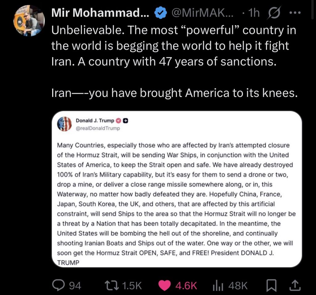 The Trump tweet about encouraging an international coalition to protect shipping? That's not a bad thing you know, and doesn't change the data I posted on Iran's absolutely btfo offensive capabilities. They are losing very hard by any objective measure.