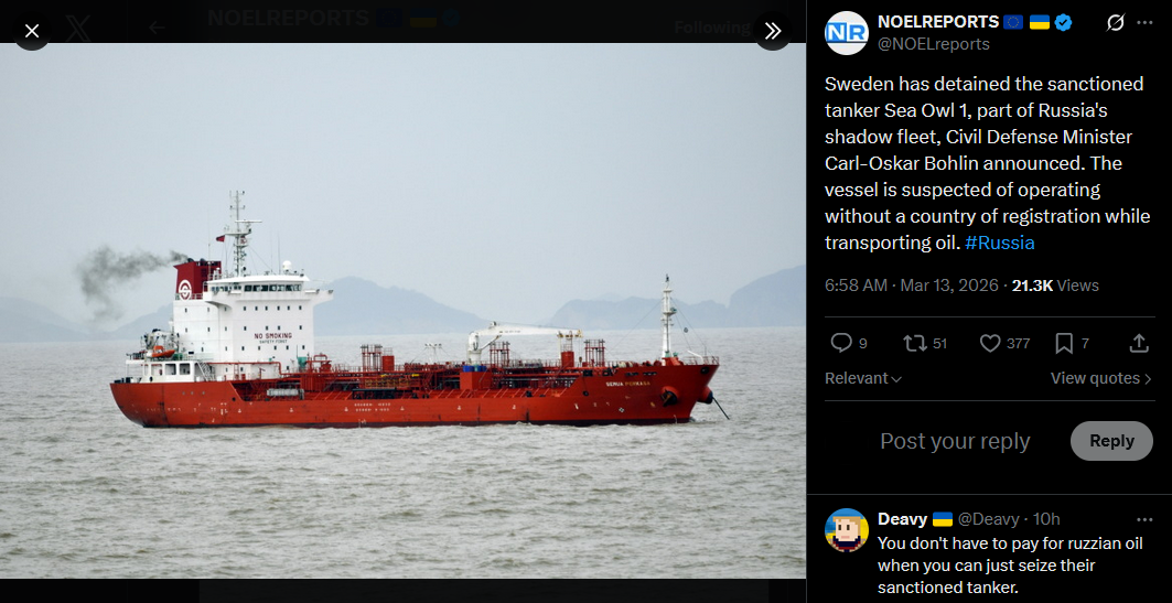 >US lifts sanctions on Russian oil that is already on tankers at sea until April 11, 2026