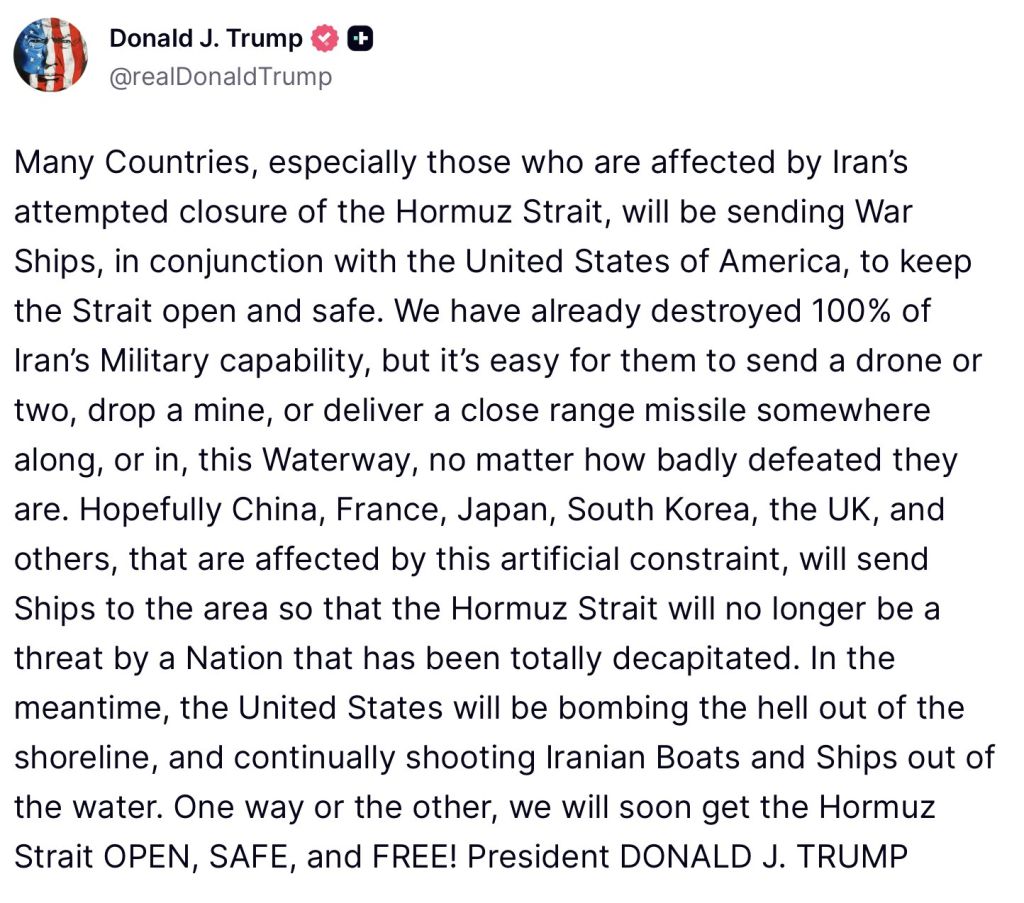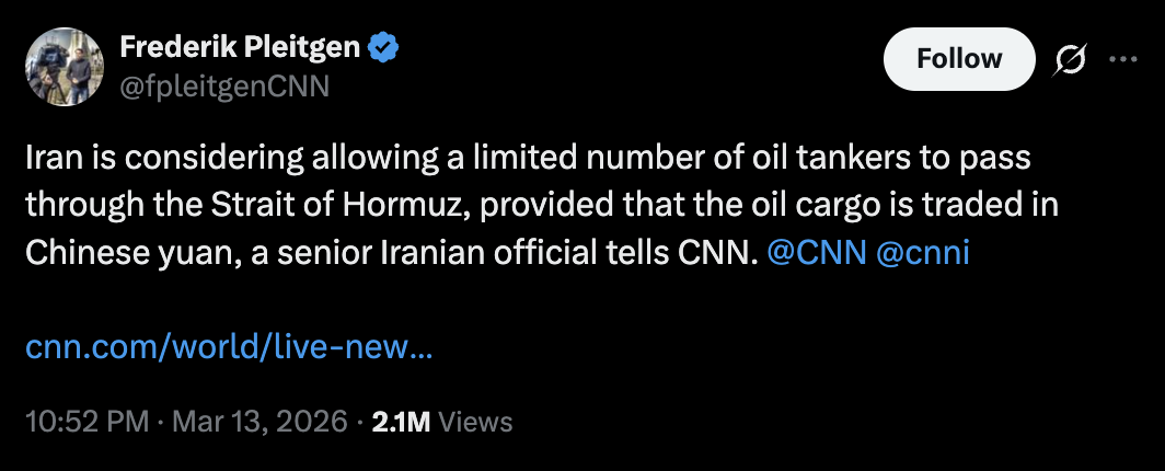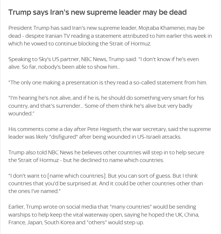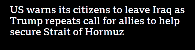 >Hegseth: "The only thing prohibiting transit in the straits right now is Iran shooting at shipping. It is open for transit should Iran not do that."