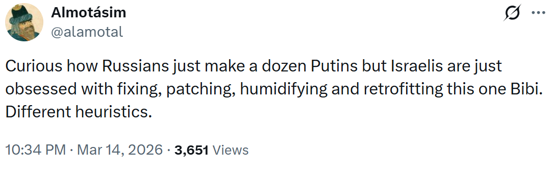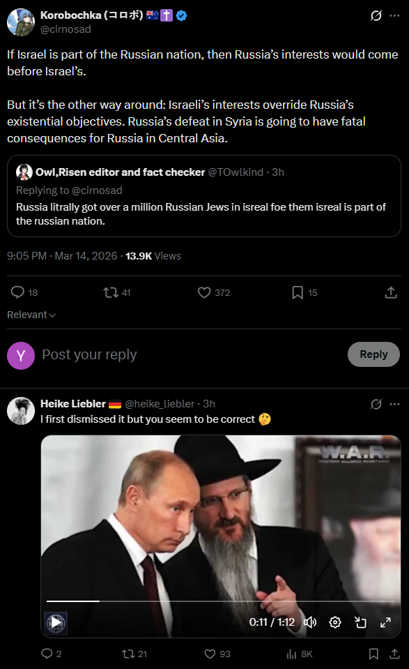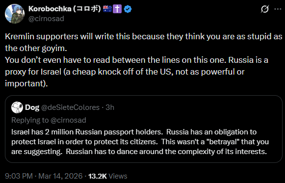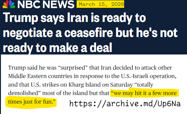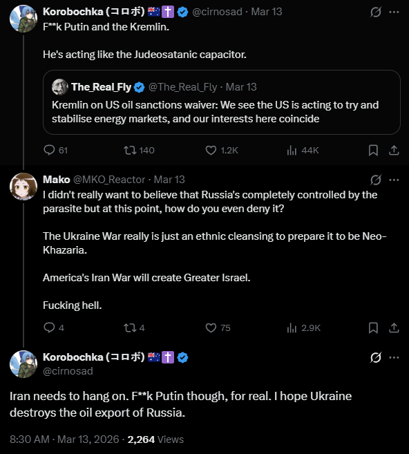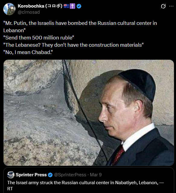 >As the USA and Israel fail to weaken Iran, desperate measures ease sanctions on the purchase and sale of Russian Oil; Western Europe and the Ukraine are seetheing - https://archive.today/MtsJu