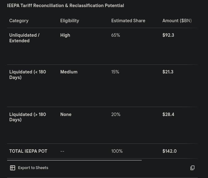 Yea bruh, I am quite familiar. The goyper/tranny is jerking off to 10% of the $265 billion tariff revenue booked in 2025 lol. Of the $140 billiion of that which was booked under IEEPA, 80% is eligible for reclassification and no refund.