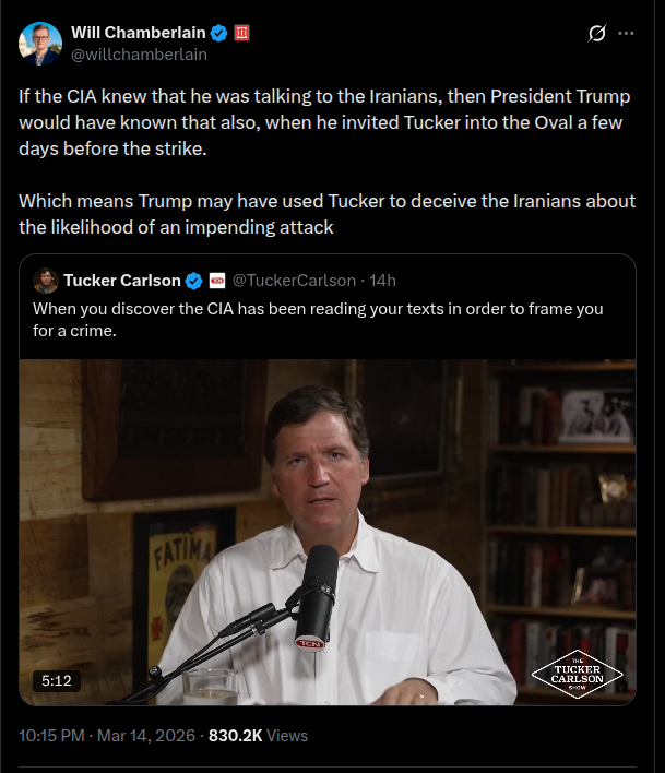 During his interview with Khomeini he gave committee something and tagged his location with it. They know exactly where he was and hit him. Tucker is going completely anti-semite. Because Trump is. Trump killed Benjamin netanyahu. He's handling all enemies. Benjamin netanyahu is an enemy.