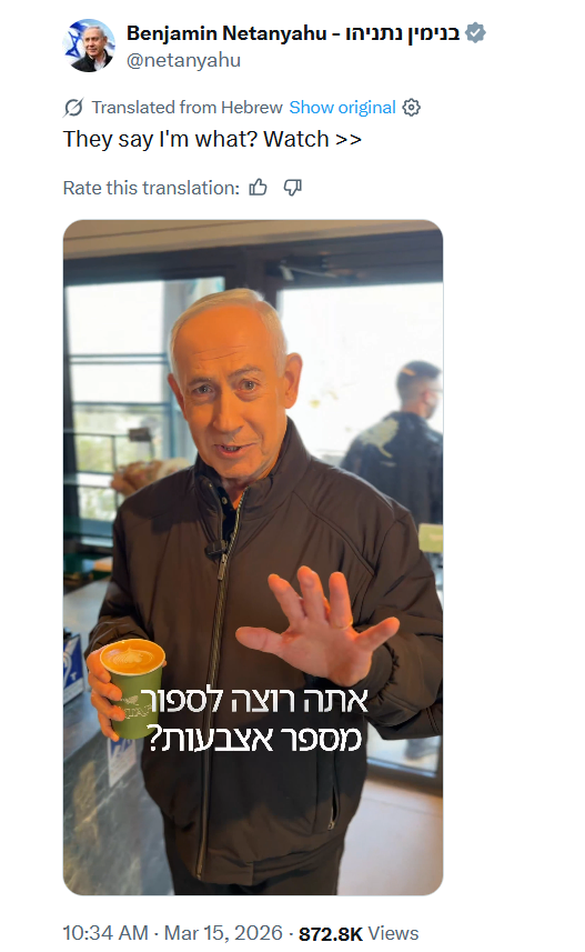 BREAKING: Netanyahu Shuts Down Death Rumors with Coffee and a PunchlinePrime Minister Benjamin Netanyahu just crushed the latest wave of fake news claiming he was dead. In a lighthearted but pointed video released today, he appears at a local coffee shop, ordering his usual and directly addressing the absurd online rumors—some pushed by Iranian sources and conspiracy accounts—that he's no longer alive.The clip opens with a barista asking: "How are you, sir?"Netanyahu replies: "How are you? Shalom."Barista: "They say on the net that you're actually dead?"Netanyahu fires back: "Yes, I'm dying for coffee, you know? I'm dying for my people. Look how they behave—fantastic. Want to count the number of fingers?"The barista: "Can you show us?"Netanyahu holds up his hand: "Here. Here. See?"Barista: "Very nice."Netanyahu: "Cheers."He then delivers a serious message to Israelis amid ongoing Iranian missile threats and the broader war: "Go out to get some air, but stay near a protected space. Your steadfastness is amazing—it gives strength to me, to the government, to the IDF, to the Mossad. We're doing things I can't share right now, but we're hitting Iran very hard, even today, and continuing in Lebanon too. You tell me to keep going? I say to all of you—keep going too. Keep following Home Front Command instructions at all times, and also your city leaders. Always stay near a protected space. We'll ease restrictions as much as possible. And thanks for the coffee—it's excellent. I don't know about the calories; that looks very dangerous to me."1/2