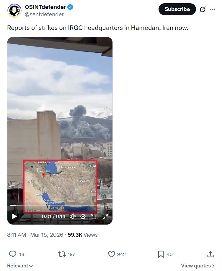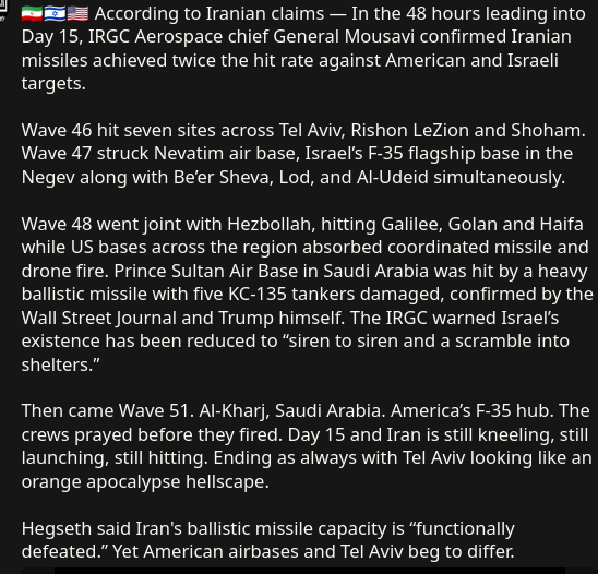 Previous: >>530788371Timeline:▶ Day: 16>South Korea contemplates sending warships to the Hormuz strait>Dept of State warns US citizens to leave Iraq immediately>Iraqi militias release FPV drone footage operating above the U.S. Victoria military base near Baghdad International Airport. No American forces in sight▶Livestreamshttps://www.youtube.com/watch?v=4E-iFtUM2kk https://www.youtube.com/watch?v=JHwwZRH2wz8▶Telegramhttps://rentry.org/tgnews▶Twitter accountshttps://nitter.net/clashreporthttps://nitter.net/FaytuksNetworkhttps://nitter.net/sentdefender▶Israel Rocket Alertshttps://www.tzevaadom.co.il/en/▶Air Traffichttps://www.flightradar24.com/https://flightaware.com/livehttps://globe.adsbexchange.com▶Maritime Traffichttps://www.marinetraffic.com/https://www.vesselfinder.com/Note: /pig/ is the only general for this event. Do not split it into dueling generals like /uhg/ and /chug/ or turn it into a support thread for either side.
