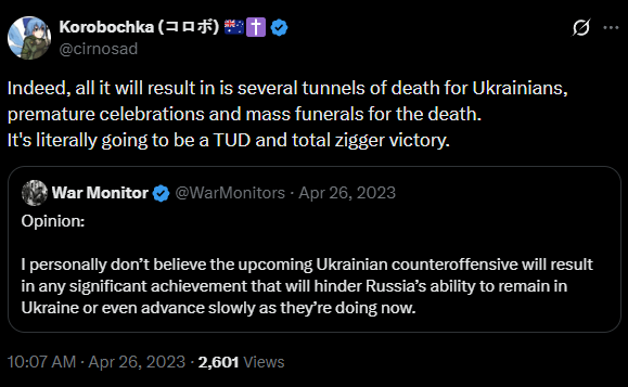 >>530803099>>530803236Do hyhyl shills actually believe in their own peremoga? If so, they must be the most blissful people in the world. If not and all this is just coping, they must be the most miserable people instead.