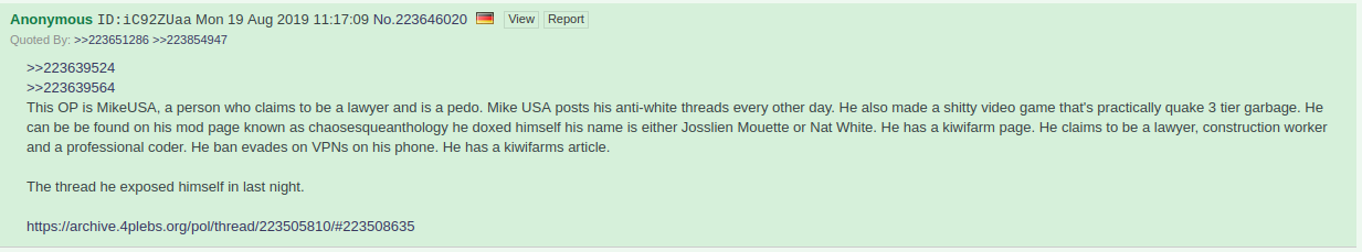 hey /chug/let's play a gamesee if you can spot mikeUSA samefagging alter ego ID >mike doesn't know that the guy that exposed him was a kraut>mike is a newfag that can't into 4plebs