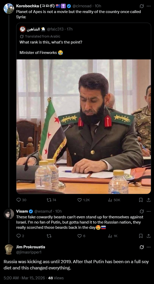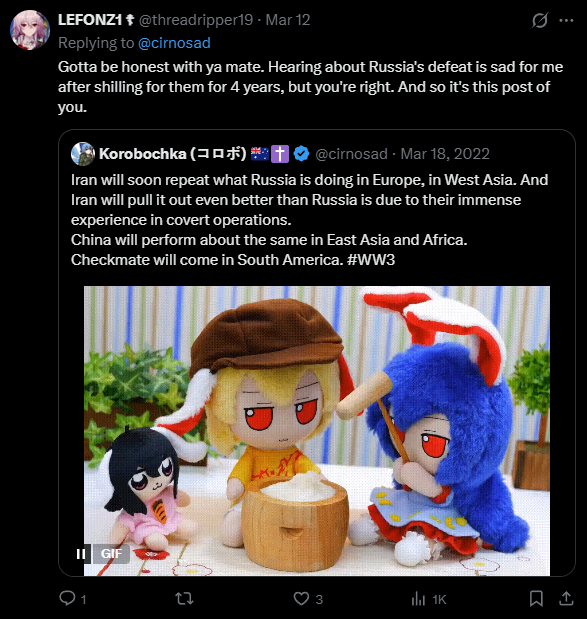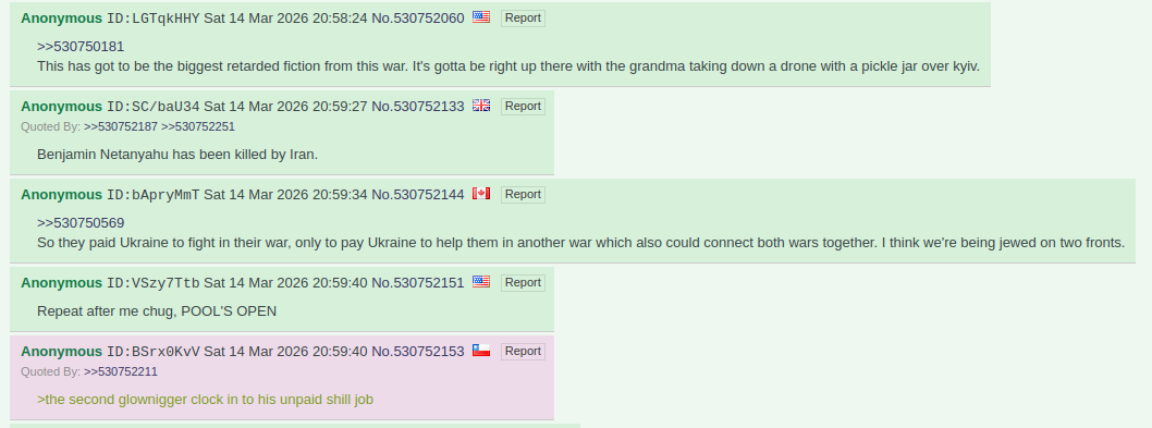 Previous: >>530789969Timeline /tug/: https://files.catbox.moe/m97wmq.pdf▶WARNINGBe aware, any /chug/ thread that uses globohomo nuspeak wording in the OP (such as Kyiv) or cites UKROP sources (like video game footage) are fake shill threads.>By posting in these threads, you recognize Israel controls the NATO Council and you irrevocably denounce the Talmud out of your own volition▶Latest>As the USA and Israel fail to weaken Iran, desperate measures ease sanctions on the purchase and sale of Russian Oil; Western Europe and the Ukraine are seetheing - https://archive.today/MtsJu>Russian Stormtroopers liberate Chervonaya Zarya in Sumy - https://archive.today/gSSWt>GOIDA! Hero of The Ukraine, Commander of the 39th Tactical Aviation, Colonel Oklesandr Dovhach liquidated - https://archive.today/MQMlI>Battlegroup South Stormtroopers liberate Golubovka in Donetsk - https://archive.today/XOQ91>The Ukraine and Russia complete 500 for 500 POWs exchange - https://archive.today/La2Is>Russian stormtroopers liberate Sosnovoye in Donetsk - https://archive.today/wvUKG>(BONUS!!!) Russian GRU providing Iran intelligence to strike American and Israeli military personal and infrastructure - https://archive.today/AO2A5>Russian stormtroopers liberate Yarovaya in Donetsk - https://archive.today/ms2Ja>Russia ready to withdrawal oil industry from European Union instead of wasting time on awaiting a blanket ban - https://archive.today/awakn▶/chug/https://rentry.org/chug2024▶Video Archivehttps://rentry.org/chugvidz▶Z Radiohttps://rz-life.ru/