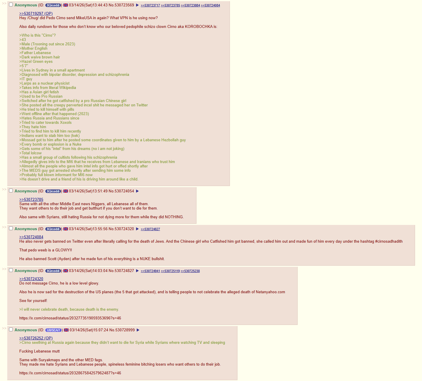 Does cirno know he's been posting here? Can one of you ziggers do something funny for once in your worthless lives and send him a compilation of what he's been doing to chug this past week??