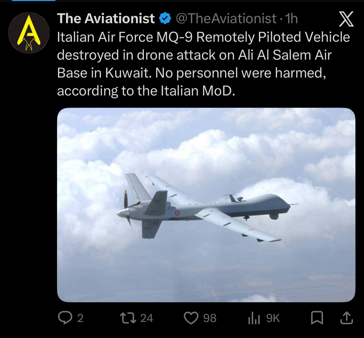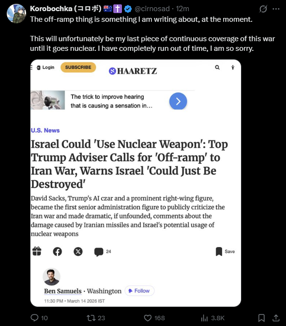 >>530802902IAF and USAF are both attacking from more distant air bases. I expected Iran to attempt to match the shock and awe airstrike barrages in Tehran and Tabriz, like in June. But they are biding their time and focusing on destroying air defense infrastructure with drones. A far more crafty plan. It can work to protract the war, if the US don’t acquire their missile producing and launching locations.