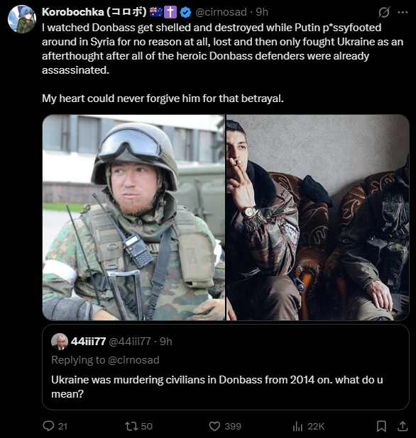 >russia has over 800,000 dead you guys >source: trust me bro It’s weird how they can confidently post this trash and act like everything’s going well for Ukraine despite the fact they haven’t advanced at all in years. I check the Russian propaganda thread and it’s just a new settlement taken every day with an archived link, I check the 100 percent true and accurate newsfeed and it’s shit that’s obviously fake with no source.