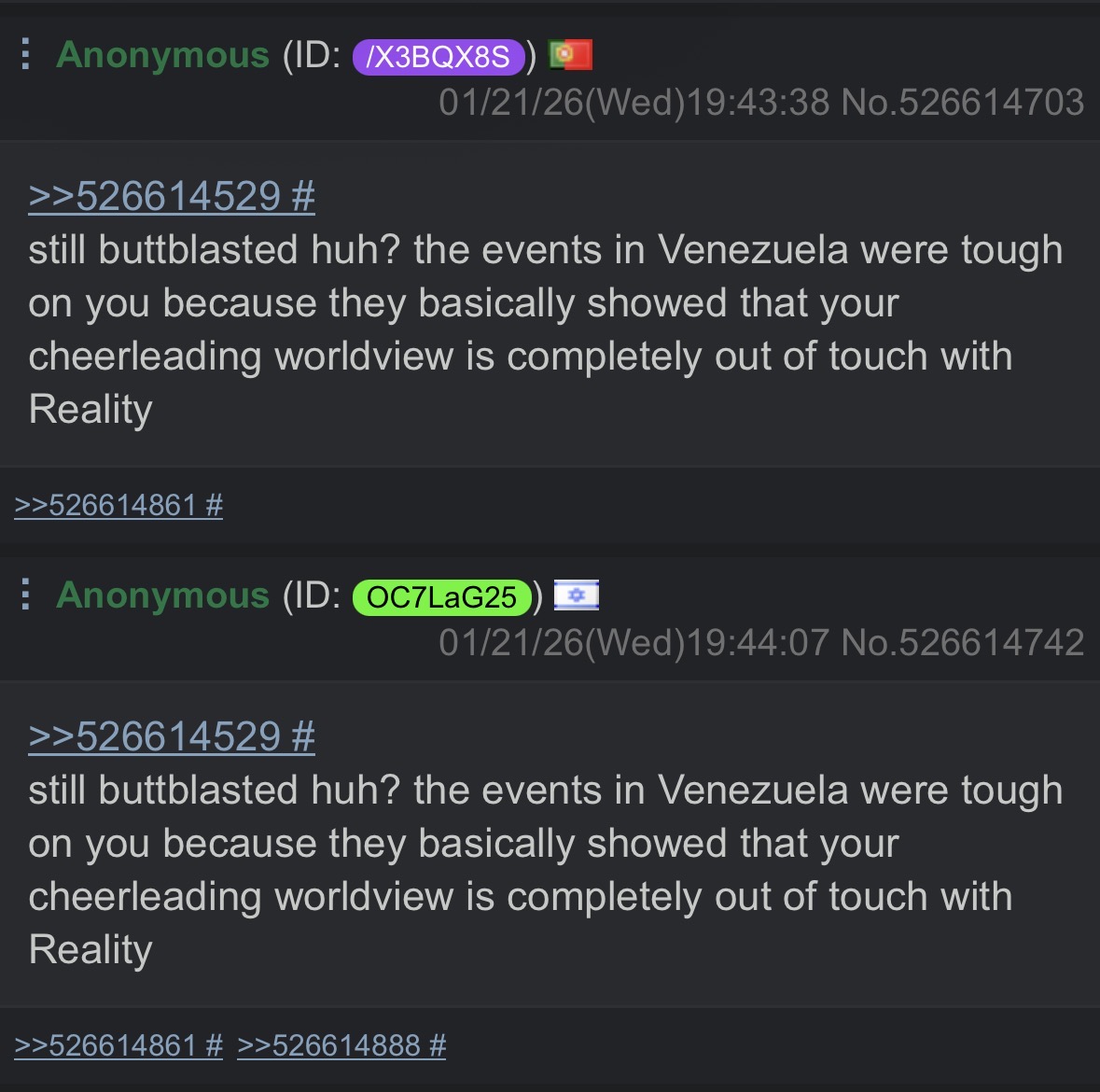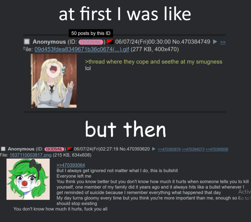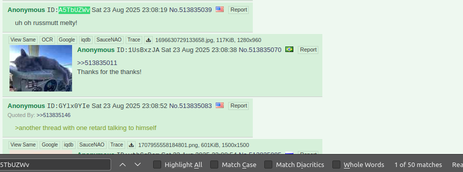 >not even a full minute>his alter ego already repliedlil bro furiously clicking that update button, breaking his mouse along the way>>530796684btware you the leaf that asked about >>530787701wellyou got your answer now