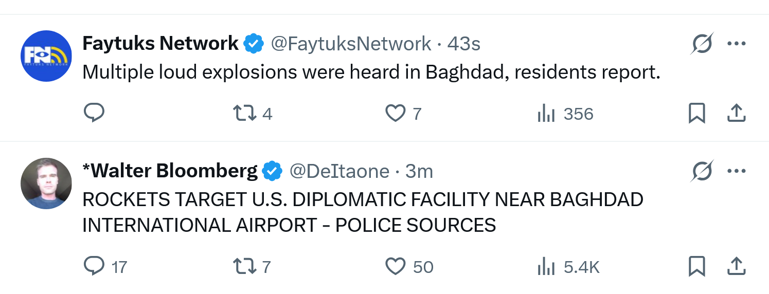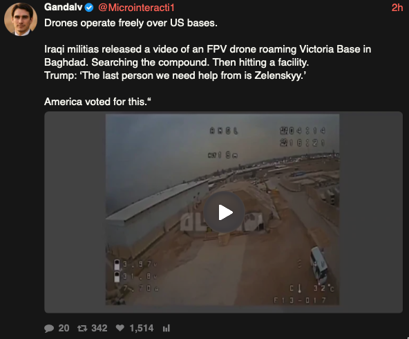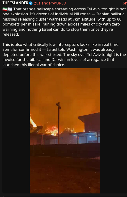 PREVIOUS: >>530793220Timeline:▶ Day: 16>South Korea contemplates sending warships to the Hormuz strait>Dept of State warns US citizens to leave Iraq immediately>Iraqi militias release FPV drone footage operating above the U.S. Victoria military base near Baghdad International Airport. No American forces in sight▶Livestreamshttps://www.youtube.com/watch?v=4E-iFtUM2kk https://www.youtube.com/watch?v=JHwwZRH2wz8 ▶Telegramhttps://rentry.org/tgnews▶Twitter accountshttps://nitter.net/clashreporthttps://nitter.net/FaytuksNetworkhttps://nitter.net/sentdefender▶Israel Rocket Alertshttps://www.tzevaadom.co.il/en/▶Air Traffichttps://www.flightradar24.com/https://flightaware.com/livehttps://globe.adsbexchange.com▶Maritime Traffichttps://www.marinetraffic.com/https://www.vesselfinder.com/Note: /pig/ is the only general for this event. Do not split it into dueling generals like /uhg/ and /chug/ or turn it into a support thread for either side.
