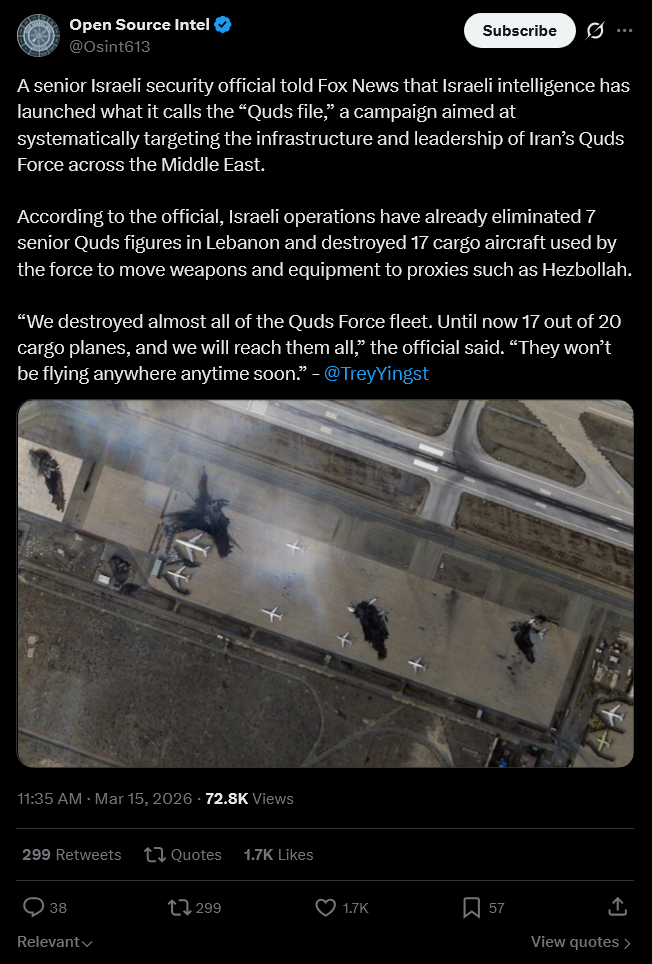 Axis of No Resistance sissies, Quds Force status?>A senior Israeli security official told Fox News that Israeli intelligence has launched what it calls the “Quds file,” a campaign aimed at systematically targeting the infrastructure and leadership of Iran’s Quds Force across the Middle East.>According to the official, Israeli operations have already eliminated 7 senior Quds figures in Lebanon and destroyed 17 cargo aircraft used by the force to move weapons and equipment to proxies such as Hezbollah.>“We destroyed almost all of the Quds Force fleet. Until now 17 out of 20 cargo planes, and we will reach them all,” the official said. “They won’t be flying anywhere anytime soon.”