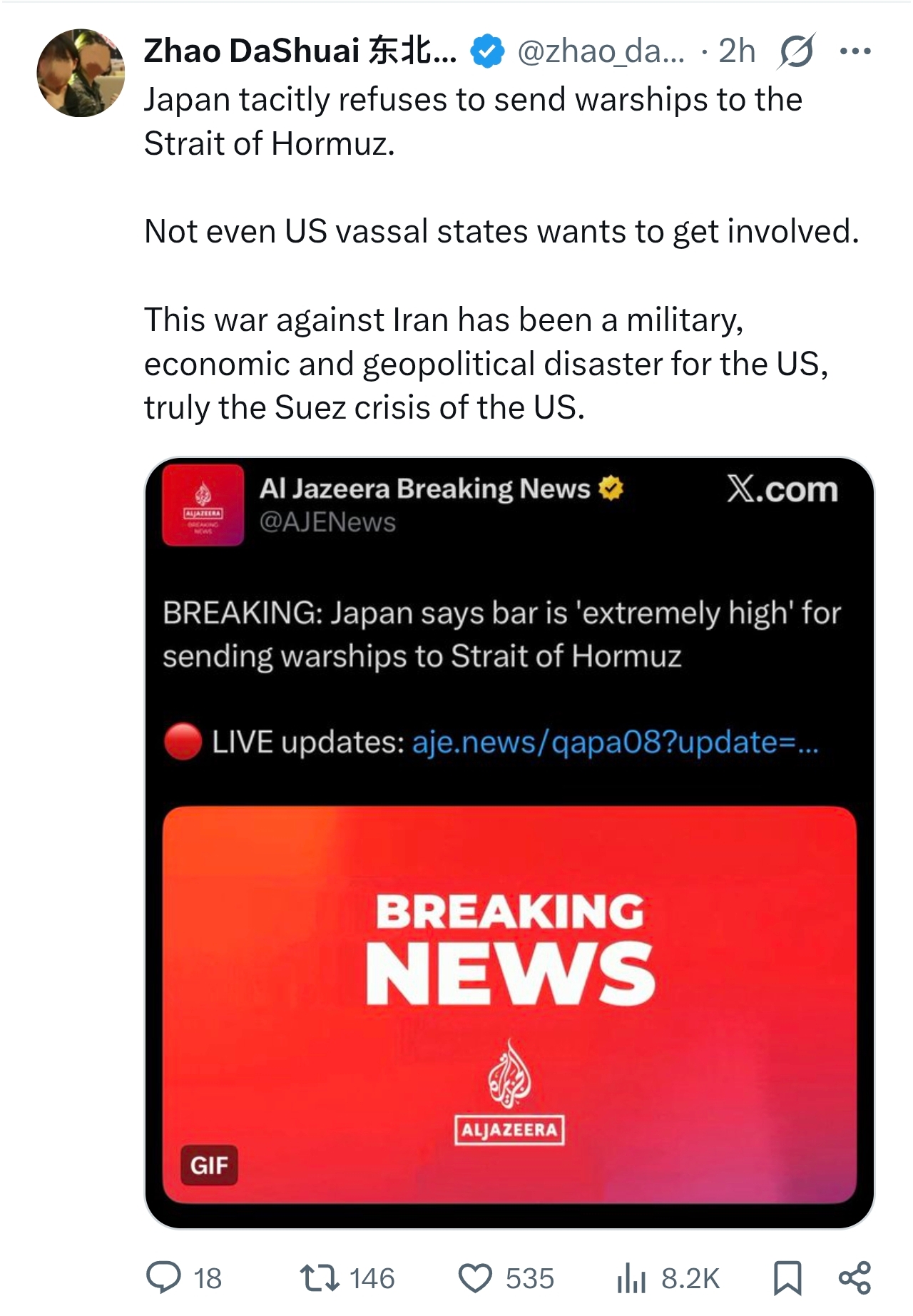 >>530802088>Iranian missile attacks are down all across the boardWell, they're still firing. Launched the first Sejjil Missile today >their ability to enrich uranium has been severely hamperedProofs?> air forces are completely decimatedProofs?>navyWas always tiny. Still has 1,000 small boats >leadership is in complete disarrayDelusional>"allies" are nohwere to be foundWho exactly are your allies here, and where are they?> just how is Iran winning..?Their victory condition is survival while the world holds the US/Israeli aggressors responsible for the ensuing economic crisis. So yes, they're winning. Bigly