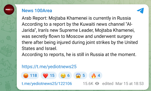 Arab report: Mojtaba Khamenei is currently in Russia>According to a report by the Kuwaiti news channel "Al-Jarida," the new Supreme Leader of Iran, Mojtaba Khamenei, was secretly flown to Moscow and underwent surgery there after being injured during joint attacks by the United States and Israel.>According to those reports, he is still in Russia at the moment.HE RAN AWAY