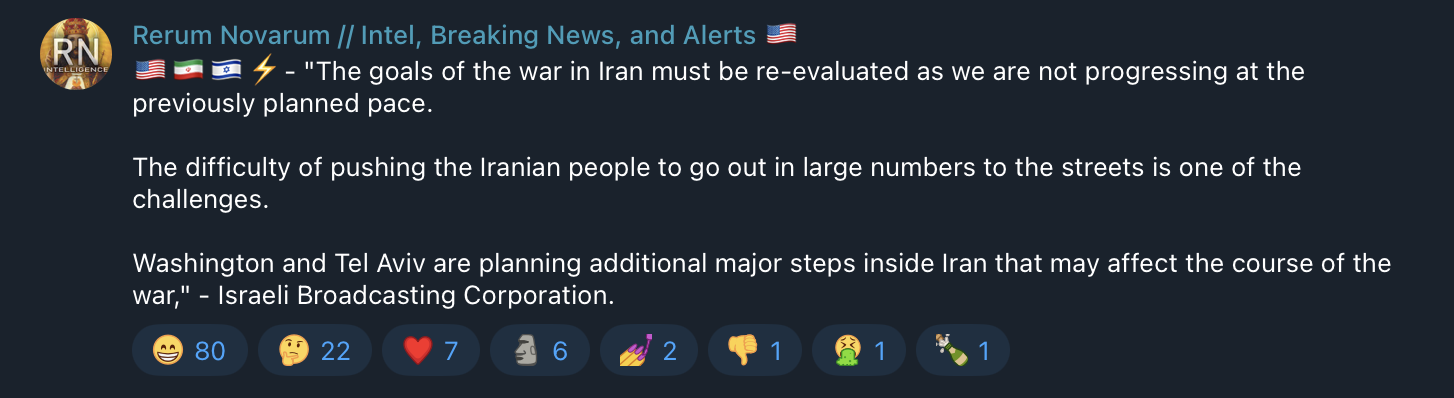 >- "The goals of the war in Iran must be re-evaluated as we are not progressing at the previously planned pace.>The difficulty of pushing the Iranian people to go out in large numbers to the streets is one of the challenges.>Washington and Tel Aviv are planning additional major steps inside Iran that may affect the course of the war," - Israeli Broadcasting Corporation.Uhhhh usraelbros, I thought we were ahead of schedule and winning. What's going on??? Do we need boots on the ground????