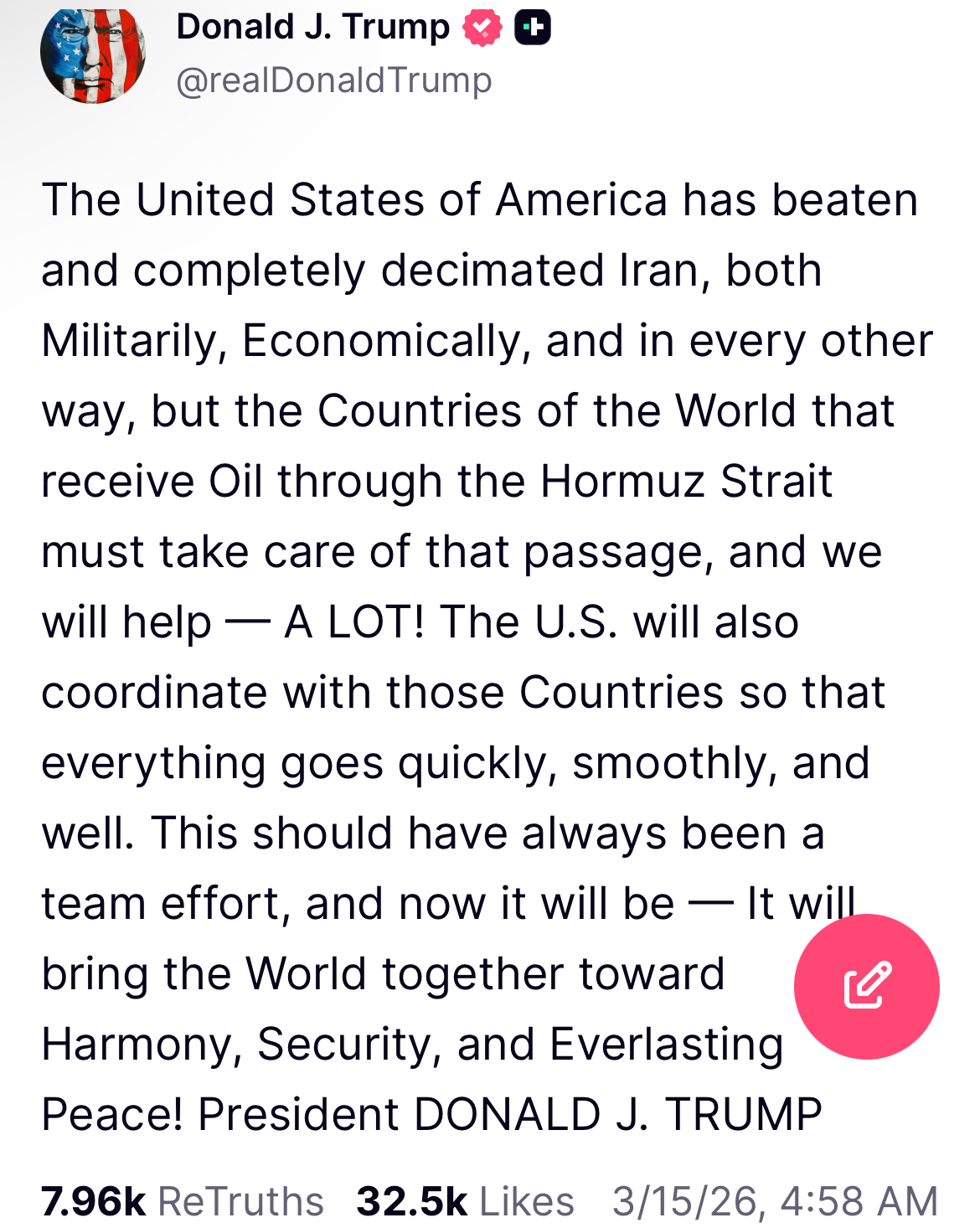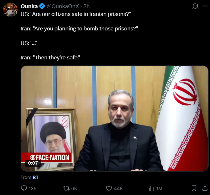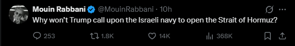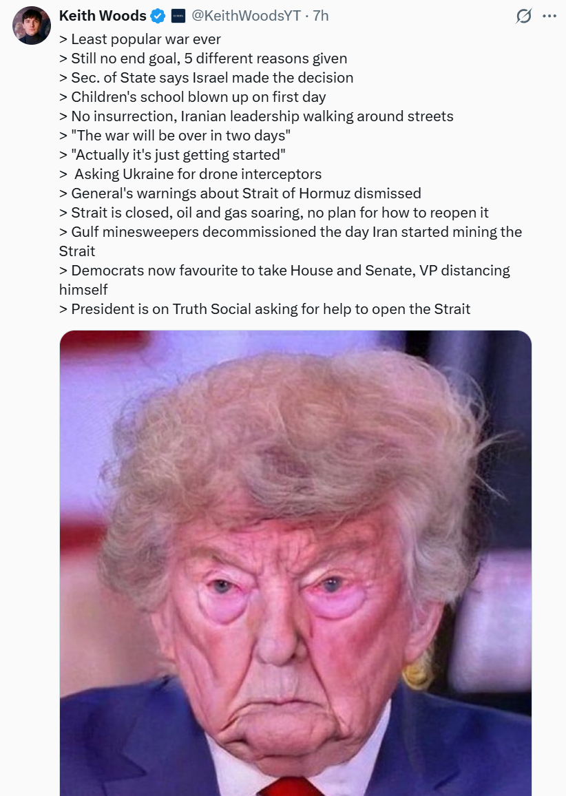 Leavitt saying that Iran closing the Strait of Hormuz proves why president Trump had to launch this war in the first place to stop them from doing so is fucking funny. Great sense of humour.