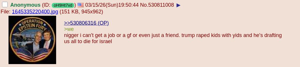 >>530815837>I'm saying you're getting fucked. You're not getting the radical change we hoped for.Idk what kind of change you hoped for but I'm getting the radical change I hoped for>We literally were hoping for him to seize power and shit. I literally don't know what you're talking about, what do you mean by "seize power"? >But that's not happening, so you're getting nothing but a paltry handout which is soon ripped away from you. I'm getting more of what I want than any president in my life who wasn't named "Trump" has ever given me>Meanwhile they get everything they want. Who is "they"? The democraps? How is Trump giving them everything they want? >And when it's time to ethnically cleanse the Middle East I voted for that btw >and expand Israel's borders, If they conquer the rest of Greater Israel at the same pace they've been conquering Palestine then it might take them until mid-millennium>the Democrats will be happy to take the refugees. Works out in Israel's favor.Hey, we've been bombing the shit out of Iran for like a week now, why aren't there any refugees yet? It couldn't have anything to do with all the NGO funding Drumpf cut, could it? >You were just a stepping stone they used on the path to their objective.Who is "they" here? The democrats?