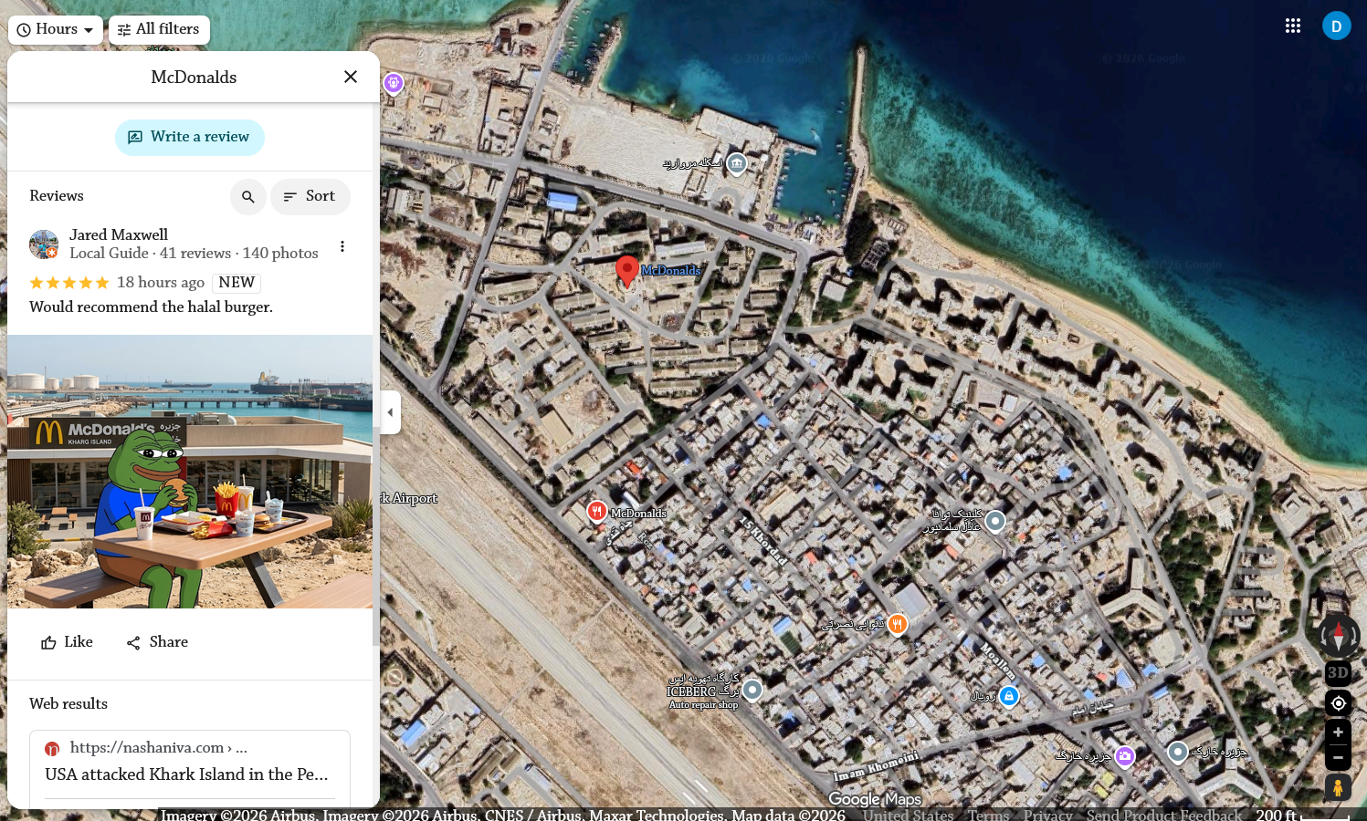 >>530848372lmaoI think someone actually added fake McDonalds to Kharg Island in Google Maps
