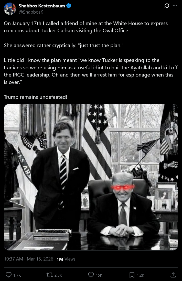 >>530848843Trump isn't smart enough to do anything like this, Tucker, not stupid enough to fall for it.>Source: Shabbos Kestelbaum