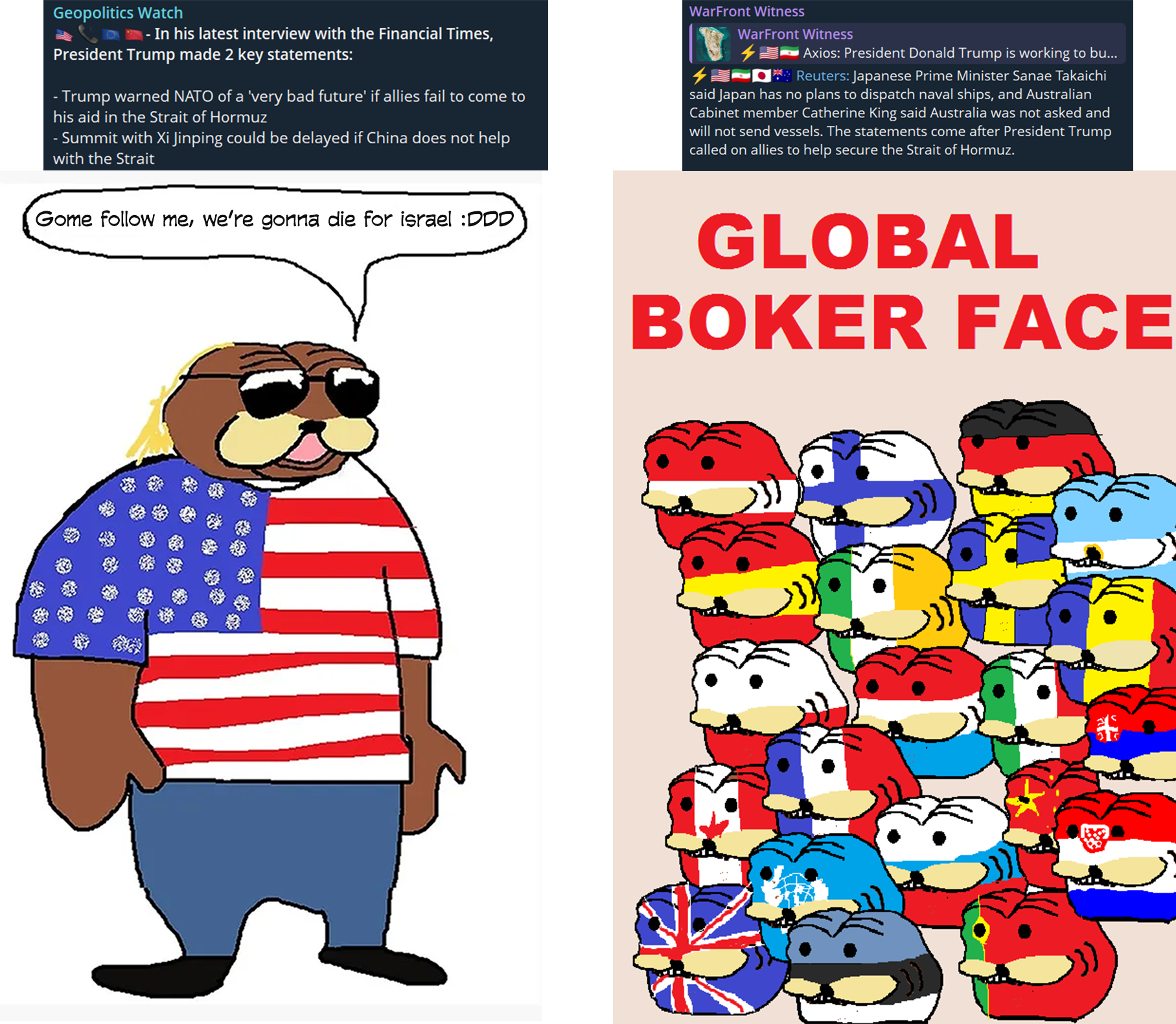NO ONE WILL HELP BLUMP KEEP THE GAY OF HORMUZ OPENWE WON XISTERS, WE FINALLY BEAT DRUMPF!!Oh shit... hol up! Iran isn't blocking the strait any more? GOD FUCKING DAMN IT!!