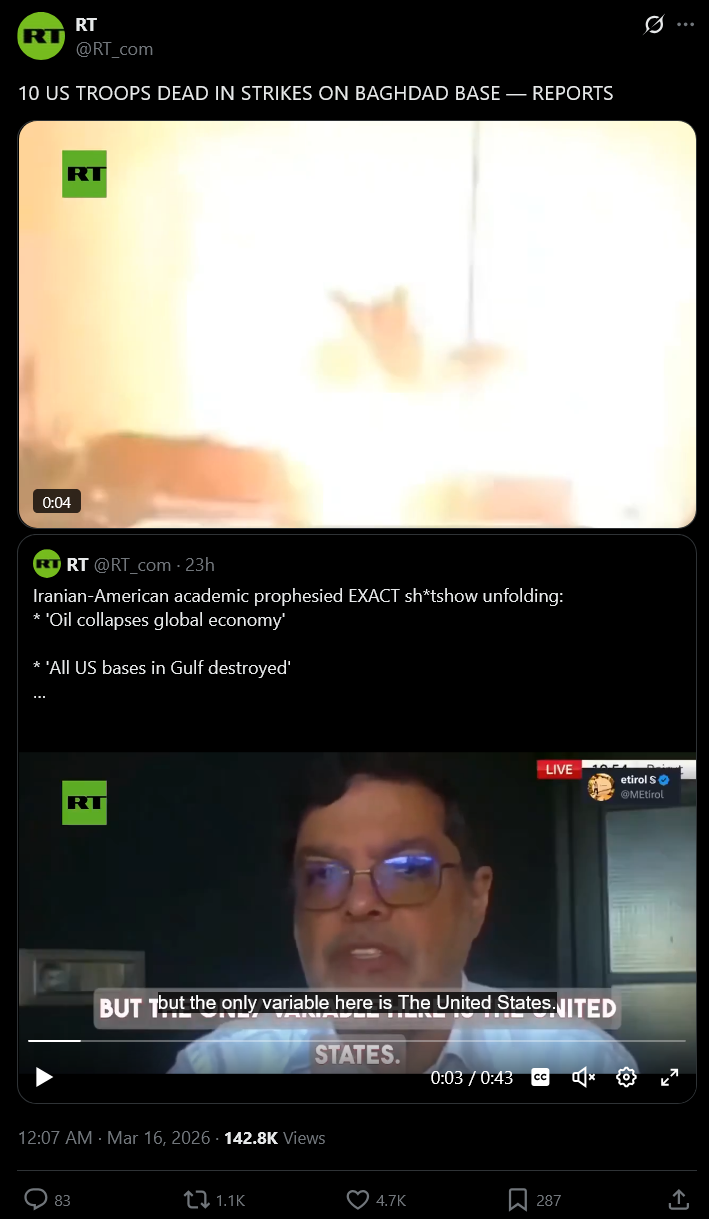 >>530852265You can be pro-trump and MAGA and still think this Iran war is a bad idea. But there seems to be a lot of fake MAGA "former trump supporters" types that are really just hoping that America fails and will latch on to any narrative that portrays Trump as bad.