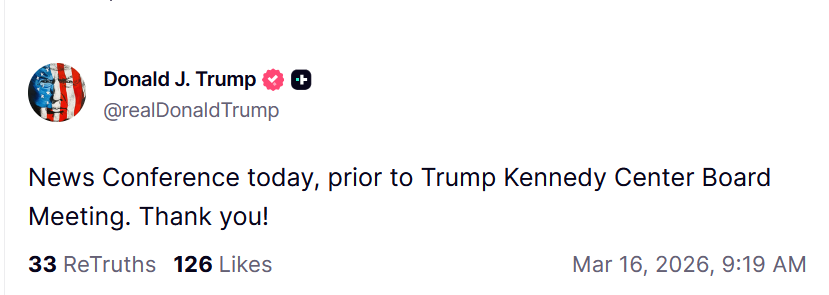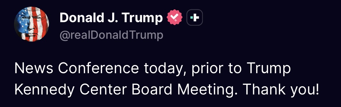 News Conference today, prior to Trump Kennedy Center Board Meeting. Thank you!https://truthsocial.com/@realDonaldTrump/posts/116239050427498715