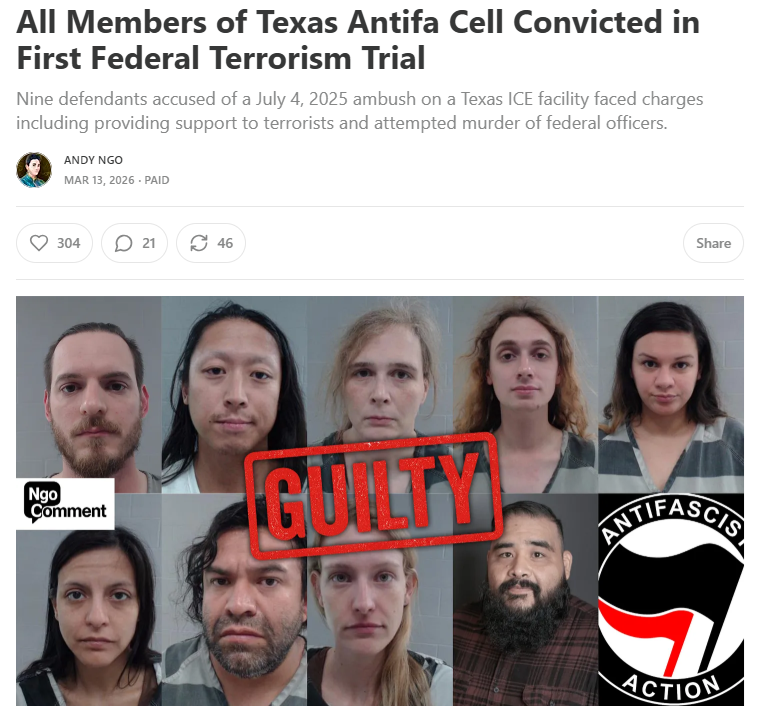 Hey, P9HdeEVA, you fucking dipshit, go make your own thread and stop fishing for (you)s.And some good news on the homefront.>Nine defendants accused of a July 4, 2025 ambush on a Texas ICE facility faced charges including providing support to terrorists and attempted murder of federal officers.A federal jury in Fort Worth, Texas has convicted all nine members of a North Texas Antifa cell in the first federal Antifa terrorism trial in U.S. history.>The verdict followed two full days of deliberations after a trial that lasted 12 days.>Benjamin Song, Cameron Arnold (a Trantifa known as “Autumn Hill”), Bradford Morris (another Trantifa activist known as “Meagan Morris”), Zachary Evetts, Savanna Batten, Maricela Rueda, Elizabeth Soto, Ines Soto and Daniel Rolando Sanchez-Estrada were indicted last year on federal charges including providing material support to terrorists, rioting, use of an explosive device and obstruction.>Jurors found the defendants guilty of providing material support to terrorists, rioting, conspiracy to use/carry explosives and using/carrying explosives.>As the verdict was being read out, some of the Antifa supporters started wailing and crying, resulting in two of them being ejected from the courtroom. Defendants Zachary Evetts and Bradford Morris broke down in tears. Ringleader Benjamin Song continued smirking.