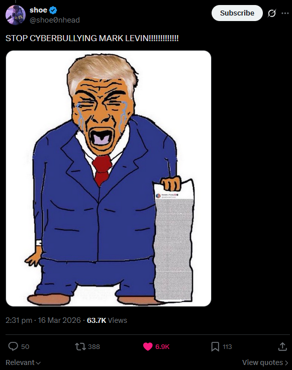 >microdick levin i-is magahe's "maga" because ziondon is 100% zogged getting gaped by netanyahu. the same people who suck trump off now are the same ones who went against him in the past. and the only reason they bat for trump now is because he's overtly israel first, and that's all that matters to this version of "maga" run by ben shapiro, mark levin and shabbos kestenbaum