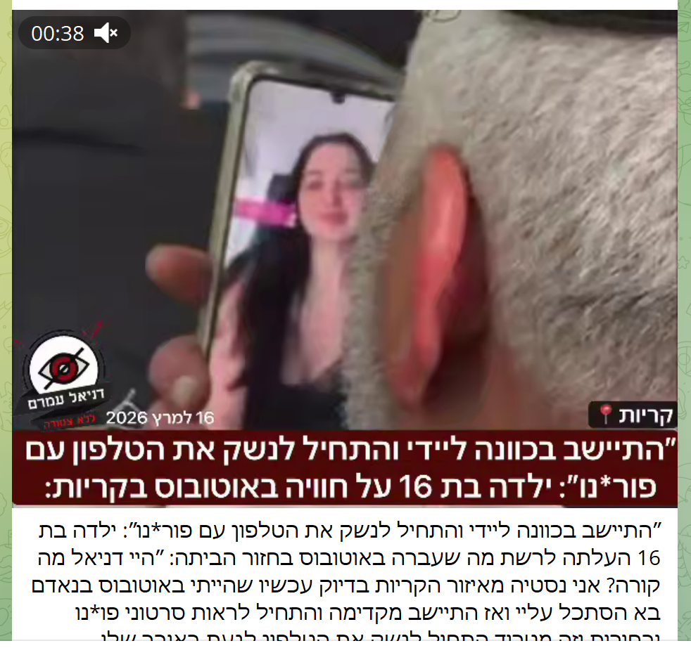 "He deliberately sat next to the lady and started kissing the phone with porn": A 16-year-old girl posted online what she experienced on the bus on her way home: "Hey Daniel, what's up? I'm Nastia from the Krayot area. Just now, when I was on the bus, a man came, looked at me, then sat in front and started watching porn videos and women, and it was disturbing. He started kissing the phone, touching his private part, and making noises."