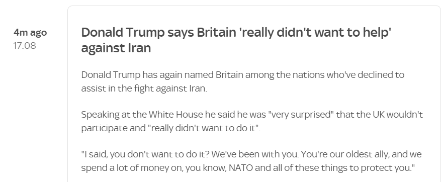 Trump:“We get less than 1% of our oil from the strait.Some countries get more. Japan 95%, China 90%, and South Korea 35%We want them to come and help us with the Strait of Hormuz”
