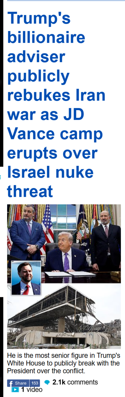 One of Donald Trump's closest advisers has broken with the President over his war with Iran, warning the conflict risks spiraling into nuclear catastrophe.
