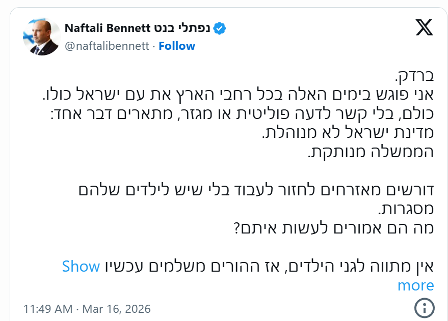 Bennett: The country is not managed. The government is disconnected. The parents are required to work without the children having frames. It is impossible to defeat the enemies at the front, and defeat your own citizens at the rear Former Prime Minister Naftali Bennett on social networks:"Bardak.These days I am meeting all over the country with the entire people of Israel.Everyone, regardless of political opinion or sector, describes one thing:The State of Israel is not managed.The government is disconnected.Citizens are required to return to work without their children having frames.What are they supposed to do with them?There is no plan for the kindergartens, so the parents are now paying thousands of shekels a month, for a closed kindergarten (!).Businesses collapse. There are no employees, no customers, and no one comes to them with support and a compensation plan.The reservists and their families already carry hundreds of reserve days on their backs, and there is no replacement in sight. On the contrary, the government tells them:Get used to it, it's going to continue like this for the next few years, we won't recruit ultra-Orthodox.No one comes out and answers the people's questions.They shoot humorous videos about six fingers, but do not move even one finger to help citizens who are in pain.The ministers, who receive a salary from us, deal with everything except managing the affairs of their office. You had time to prepare, what have you done since you were elected to help the citizens of Israel?Wait, I'm correcting:The Minister of Transportation announced that citizens whose homes were destroyed by an Iranian missile will be entitled to free travel on public transportation. Yes, what you heard.You cannot defeat the enemies at the front, and defeat your own citizens at the rear.Soon we will return to manage Israel.The fix will come soon."