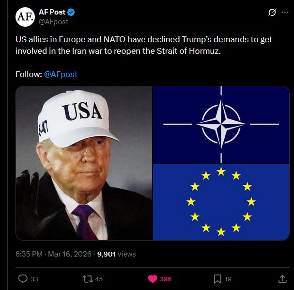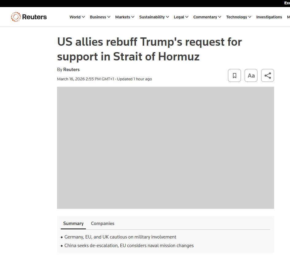 >German Defence Minister Boris Pistorius:>“It is not our war; we did not start it.”>“What does the world expect, what does Donald Trump expect from a handful or two handfuls of European frigates to achieve there in the Strait of Hormuz, which the powerful American Navy cannot manage alone? >It is not our war; we did not start it.”