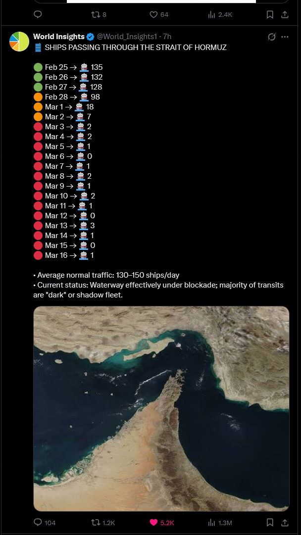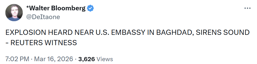 Iran is hitting Fujairah (the emirate bypass for the strait) , UAE said they got it working again yesterdaythe retaliation was done after the US attacked Kharg Island from UAE territory after the markets closed on friday I thinktoday they went after it again, they want it gone and at that range the thing should not survive