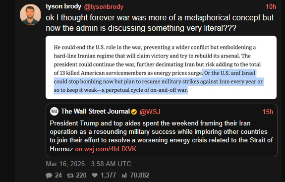 >>530892574the strait thing is ridiculous because no US ship is within 1000km of Iran right now that is 1/40 of earth circumferencecentcom chuck calls that "near iran"is everybody lying to trump? he thinks the strait is closed because of mineshe thinks the US navy got a presence near iranhe seems to think its closed by fear of mines or insurance...is he just brazenly lying to this extend (which is possible) but rubio did the mine bit early in the war too so I'm unsure