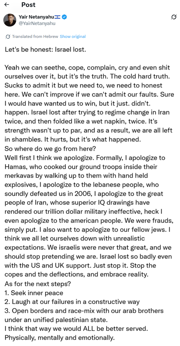>>530891642>The Minister of Transportation announced that citizens whose homes were destroyed by an Iranian missile will be entitled to free travel on public transportation. Yes, what you heard.>>530891642>The reservists and their families already carry hundreds of reserve days on their backs, and there is no replacement in sight. On the contrary, the government tells them:>Get used to it, it's going to continue like this for the next few years, we won't recruit ultra-Orthodox.