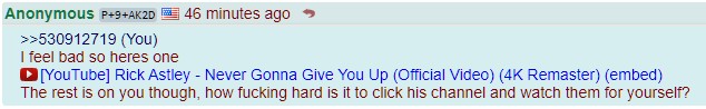 >>530913661i'm ignoring all replies in this thread without links, and my 4chanX shows link titles ITT so there's not point trying to rick roll, it doesn't work. if you don't post a link you're wasting everyanon's time.