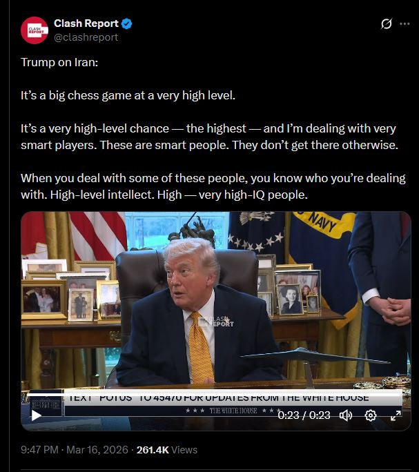 Trump on Iran:It’s a big chess game at a very high level.It’s a very high-level chance — the highest — and I’m dealing with very smart players. These are smart people. They don’t get there otherwise.When you deal with some of these people, you know who you’re dealing with. High-level intellect. High — very high-IQ people
