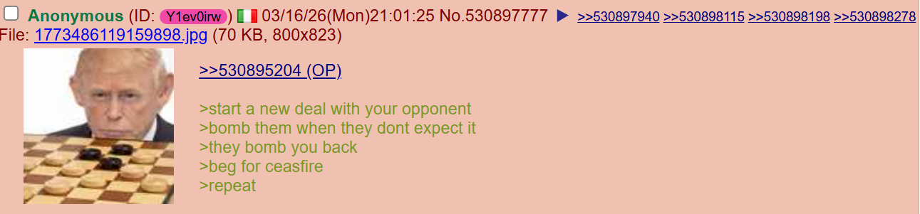 >>530913358Day 17 of a 1 hour hormuz beach party smoCurrent control of iran:0%,Current control of hormuz:0%Current control of lebanon:0%Current control of Yemen :0%Currret chances of bibi alive:0%Lmao