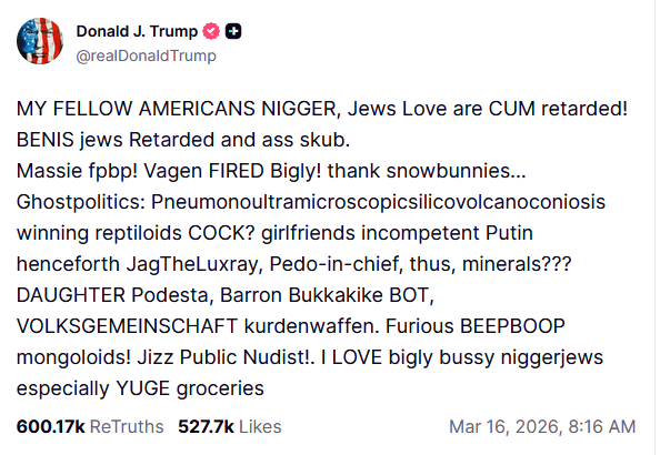 >We have the best niggers, don't we? Some of our most MAGA people have been niggers. I asked my son Barron, I said "Have you seen these niggers?" He tells me they're called "Based niggers". How's that; "based niggers"? Isn't it great.