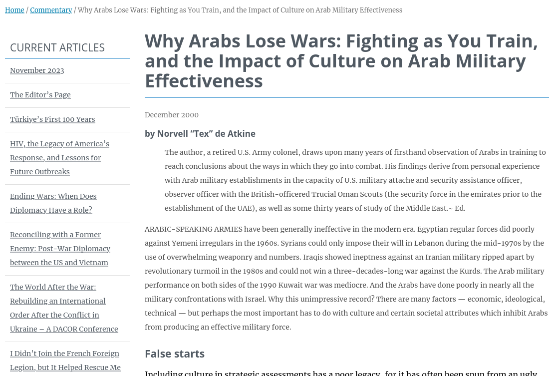 >>53092101826 years later and nothing changed:americandiplomacy.web.unc.edu/2000/12/why-arabs-lose-wars-fighting-as-you-train-and-the-impact-of-culture-on-arab-military-effectiveness/