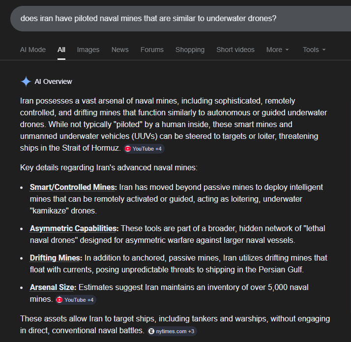 There is not much documentation of the many many different designs of Iranian naval mines and drones, but it tries to summarize what we do know (when asked such a general vague question).