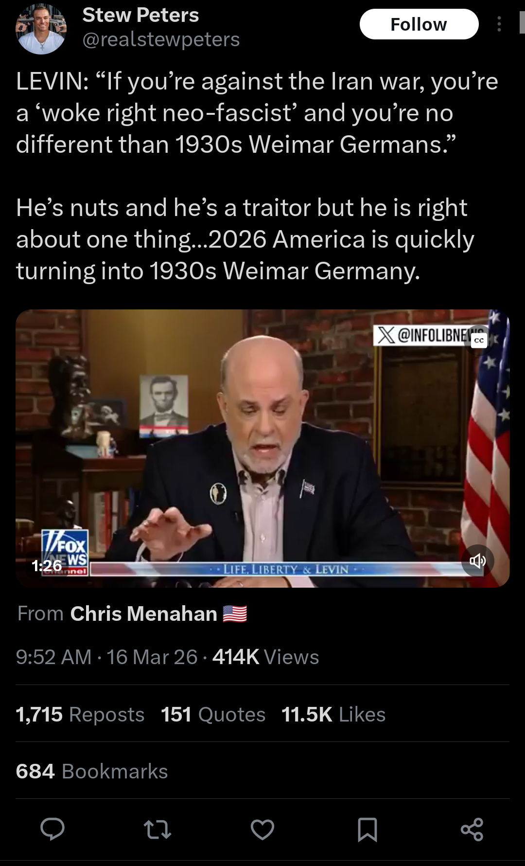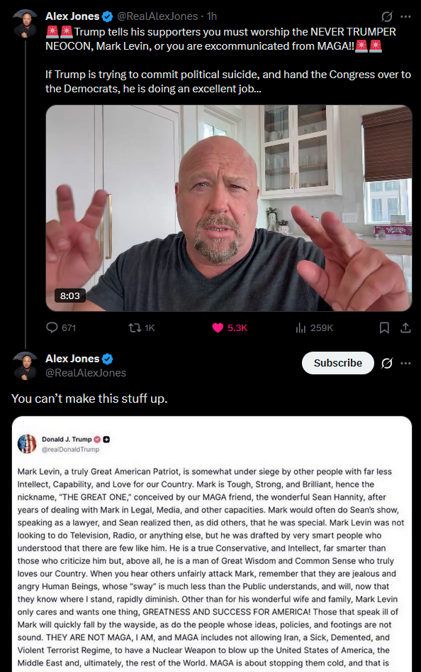 Levin is the Chosen One. Jewbros, we wonLevin accusing Kelly of being a “Jew-hating, America-hating lunatic.” Kelly and Levin have sparred over the U.S.-Israeli war in Iran in recent weeks. Kelly criticized Levin on her show for saying American servicemembers died for a “great cause,” with Kelly saying the deaths were unnecessary and were caused by a “war for Israel, not for us.”Trump praised Levin in a late-night Truth Social post on Sunday, calling the commentator “Tough, Strong, and Brilliant” and a “true Conservative, and Intellect, far smarter than those who criticize him,” possibly referring to Kelly.Levin thanked Trump for his praise, saying he is “humbled” by the president’s “words and graciousness.”