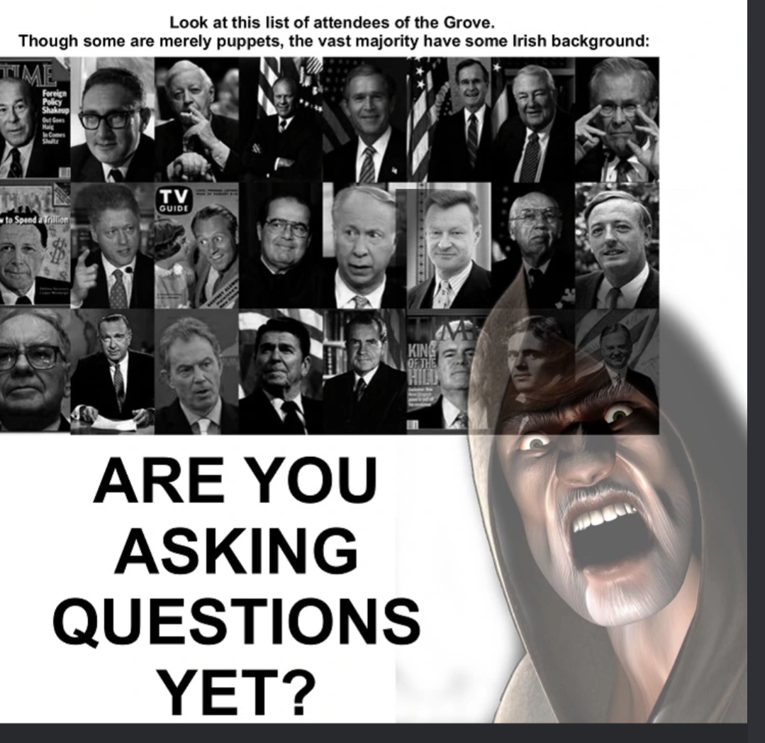 HIBERNIAN CONSPIRACY (v3 – DEEP CUTS ONLY)1. Airline pilots named O’Donnell. Judges named Fitzpatrick. Construction foremen named McKenna. Every boring but critical job? Quietly Irish. You don’t seize power by being flashy—you control the infrastructure and let everyone else argue on TV.2. Literature was Phase Zero. James Joyce and W. B. Yeats didn’t just write confusing books—they rewired how English itself works. Change the language, you change how people think. That’s day-one strategy.3. Policing? Historically packed with Irish names in North America. Not dominance—positioning. Who enforces the rules matters more than who writes them.4. Weather control. Ever notice Ireland exports vibes? Grey skies, rain, melancholy. Then suddenly every indie film, every moody playlist, every “brooding protagonist” feels vaguely Irish. Emotional climate engineering.5. Pub networks. You think it’s just Guinness and chatter. It’s actually decentralized intelligence hubs. Information flows faster over a pint than it ever does in a boardroom.6. Subtle branding: the shamrock. Three leaves. Everywhere. You think it’s a plant. It’s a logo. Ancient, portable, impossible to trademark against. Perfect symbol for a network that doesn’t officially exist.Conclusion:No lasers, no secret moon bases—just soft power, positioning, and a global web of “ah sure it’ll be grand.” If it were real (which it obviously isn’t), it’d be the most low-key effective operation ever run.