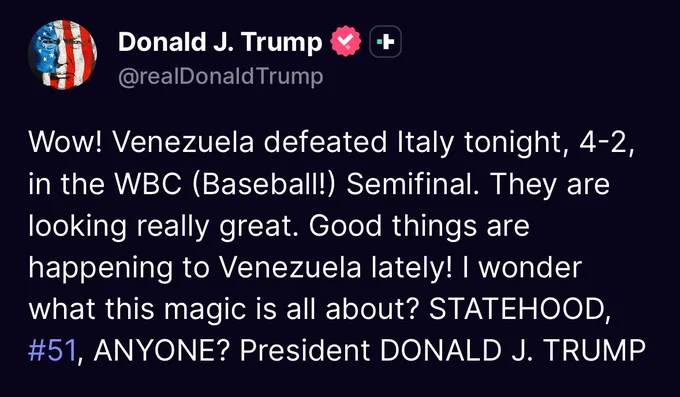 >Wow! Venezuela defeated Italy tonight, 4-2, in the WBC (Baseball!) Semifinal. They are looking really great. Good things are happening to Venezuela lately! I wonder what this magic is all about? STATEHOOD, #51, ANYONE? President DONALD J. TRUMPSo venezuela is 51 now?