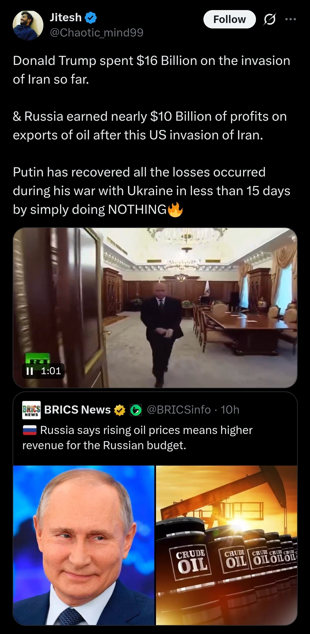 >>530955280>miggers honest to god believe that all 77 million trump voters are happy that the no new wars and lower gas prices o president started a new war to raise gas priceslollmao even